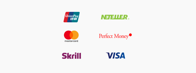 • WebMoney, Skrill, Perfect Money, Neteller, Wire transfer, Fasapay, Kartu bank, Online banking lokal, ChinaUnionPay